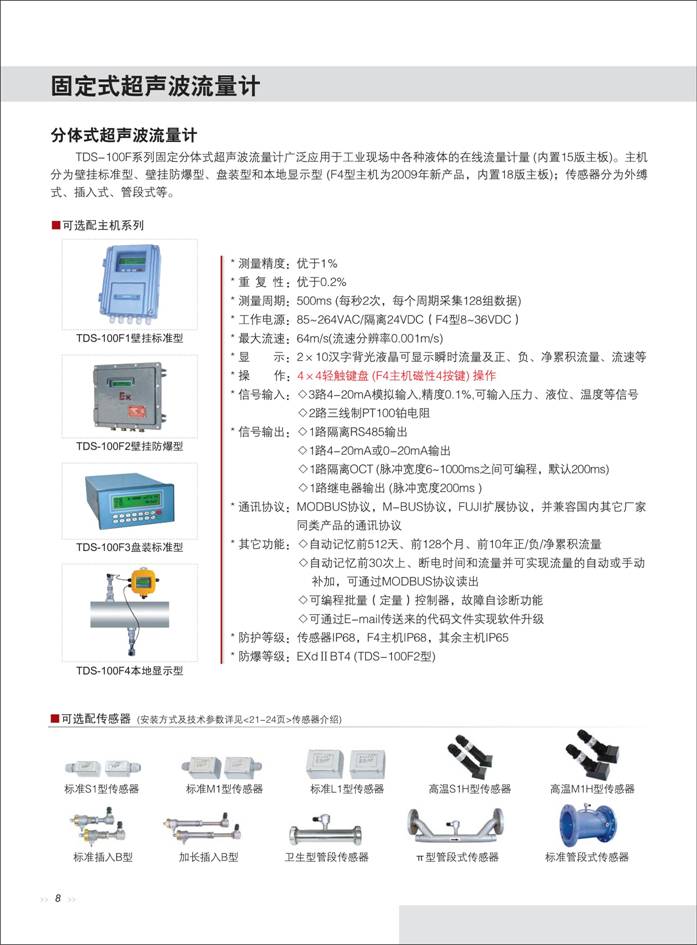 超聲波流量計(jì) 一、概 述 AK-TDS-100F型固定式超聲波流量計(jì)利用了低電壓、多脈沖時(shí)差原理,采用高精度和超穩(wěn)定的雙平衡信號(hào)差分發(fā)射、差分接收數(shù)字檢測(cè)技術(shù)來測(cè)量順流和逆流方向的聲波傳輸時(shí)