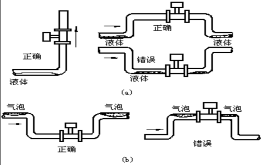 7. 測量液體時,為了保證管內(nèi)充滿液體,所以在垂直或傾斜管道安裝儀表時,應該保證液體流動方向從下而上。若管道內(nèi)含少量氣體,為了防止氣體進入儀表測量管,儀表應安裝在管線的較低處。