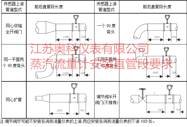 AK-LUGB系列蒸汽流量計渦街流量儀表廣泛適用于石油、化工、冶金、熱力、紡織、造紙等行業(yè)對過熱蒸汽、飽和蒸汽、壓縮空氣和一般氣體(氧氣、氮氣氫氣、天然氣、煤氣等) 、水和液體(如:水、汽油、酒精、苯類等)的計量和控制。渦街流量計蒸汽流量計可用于大、中、小型各種管道給排水、污水處理、工業(yè)循環(huán),油類及化學試劑以及壓縮空氣、飽和及過熱蒸汽、天然氣及各種介質(zhì)流量的計量并可作為流量變送器應用于自動化控制系統(tǒng)中。今天我們主要來介紹一下蒸汽蒸汽流量計的現(xiàn)場安裝要求,希望可以幫助用戶更好的應用產(chǎn)品。