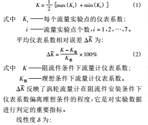 渦輪流量計的原理:當被測流體流過傳感器時,在流體作用下,葉輪受力旋轉,其轉速與管道平均流速成正比,葉輪的轉動周期改變磁電轉換器的磁阻值,檢測線圈中的磁通隨之發生周期性變化,產生周期性的感應電勢,即電脈沖信號。基于渦輪流量計的測量原理,根據渦輪流量計檢定規程,確定了實流實驗結果的評價指標,其中包括: 儀表系數、平均儀表系數相對誤差、線性度和不確定度。